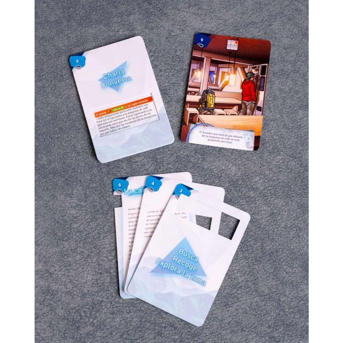 El corazón del juego está en sus cartas de acción, que permiten interactuar con el entorno, examinar objetos, resolver enigmas o enfrentarse a situaciones críticas. Estas cartas se combinan con las cartas de situación, creando un puzle narrativo dinámico donde descubrir pistas, desvelar secretos y tomar decisiones clave impulsará la historia hacia un resultado inesperado. Cada combinación puede revelar nuevas escenas, permitir resolver misterios congelados en el tiempo o empujar la trama hacia un giro sorprendente.