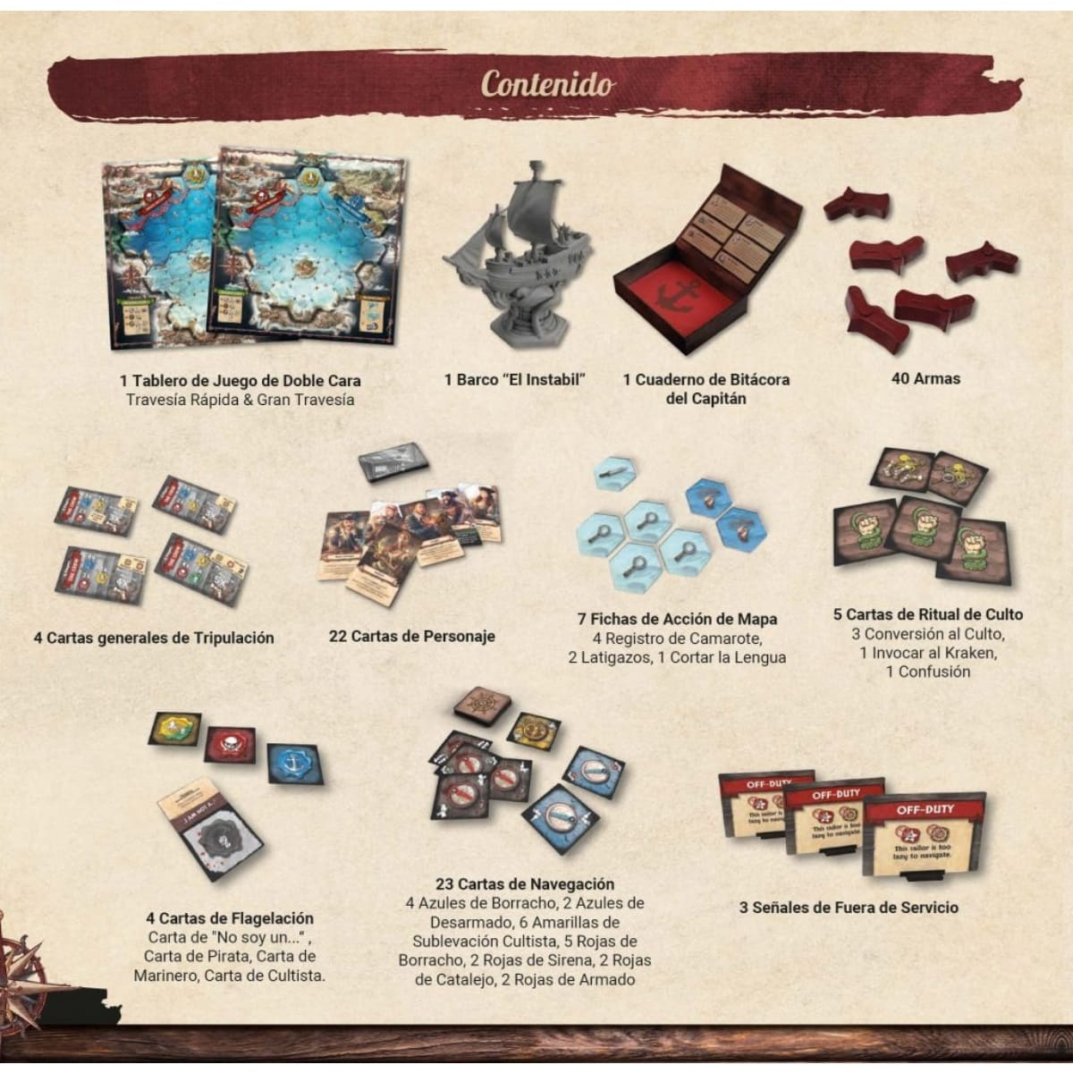 En esta travesía participan tres facciones asimétricas. Los Marineros leales luchan por llevar el barco a tierra firme y salvar a la tripulación. Los Piratas, ocultos entre ellos, conspiran en secreto para desviar el rumbo hacia Crimson Cove. Y, como elemento más impredecible, el Líder del Culto trabaja para convencer a otros jugadores de ayudarle a invocar al temible Kraken desde las profundidades del océano. Cada jugador recibe su rol en secreto y deberá utilizar la persuasión, la manipulación y la estrategia para guiar el destino del barco hacia el objetivo de su facción.