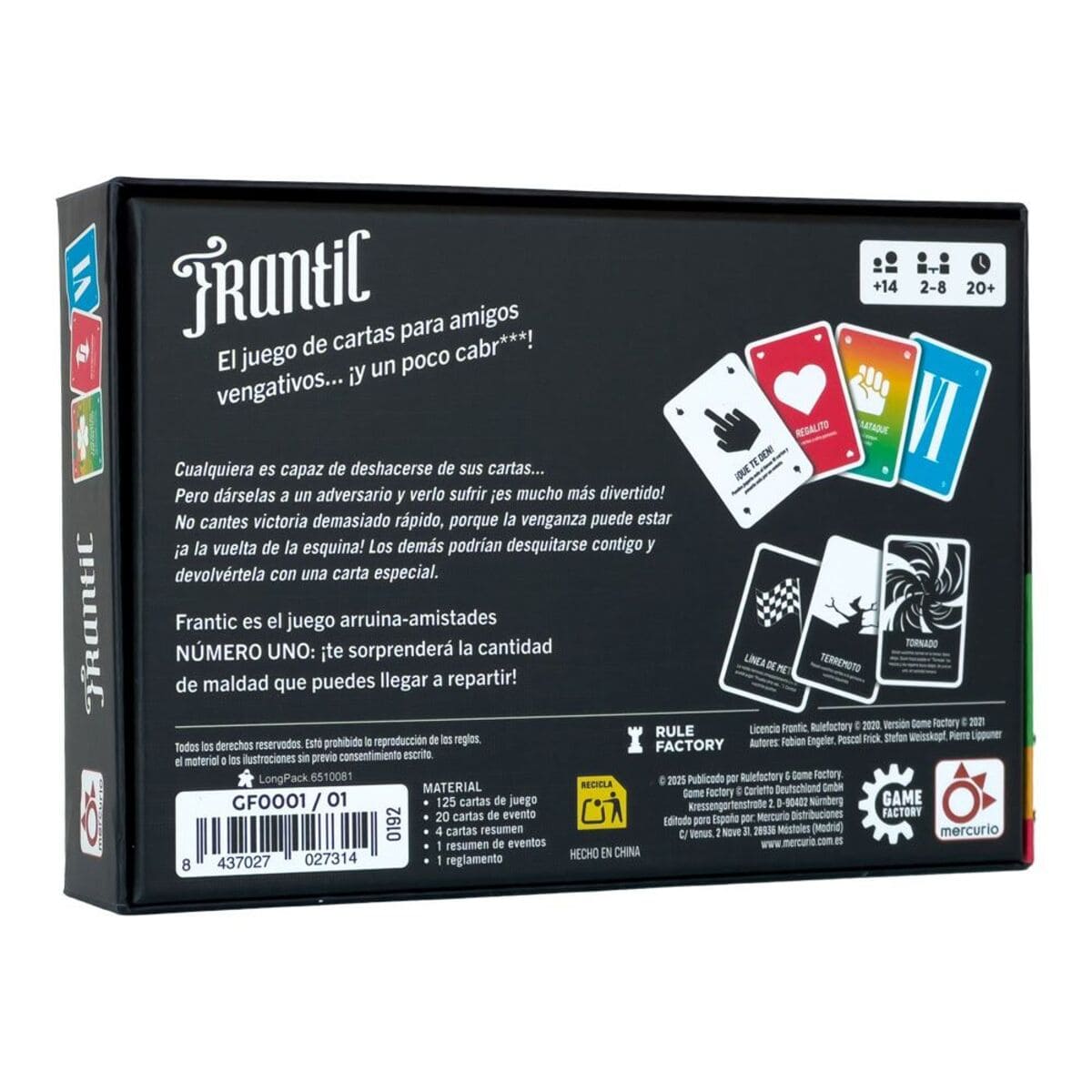 Pensado para jugadores a partir de 14 años, Frantic es ideal para reuniones sociales, noches de juegos desenfadadas o como cierre explosivo de una sesión de juegos de mesa. Si buscas un juego que rompa amistades… pero solo durante la partida, Frantic cumple exactamente lo que promete.