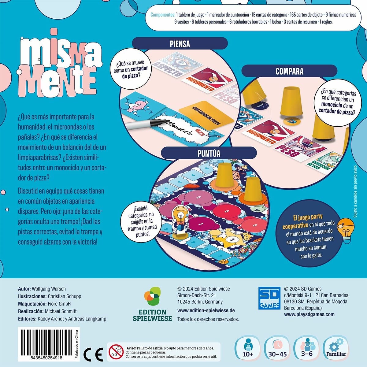 Mismamente es un juego de mesa por equipos que pone a prueba vuestra creatividad, capacidad de razonamiento y habilidad para comunicar ideas aparentemente imposibles. A través de comparaciones ingeniosas y asociaciones inesperadas, los jugadores deberán descubrir qué tienen en común objetos que, a simple vista, no guardan ninguna relación. ¿Es más importante para la humanidad un microondas o unos pañales? ¿Se mueve igual un balancín que un limpiaparabrisas? En Mismamente, cualquier idea puede ser válida… siempre que no caigáis en la trampa.