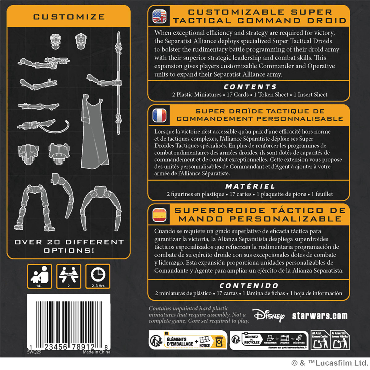 Star Wars™: Legion – Customizable Super Tactical Command Droid es una expansión clave para los jugadores de la Alianza Separatista que buscan llevar su ejército droide a un nuevo nivel de eficiencia estratégica. Cuando la victoria depende de una coordinación perfecta y decisiones tácticas impecables, los Separatistas despliegan superdroides tácticos de mando, unidades avanzadas diseñadas para suplir las limitaciones de la programación básica de combate de los droides de batalla.