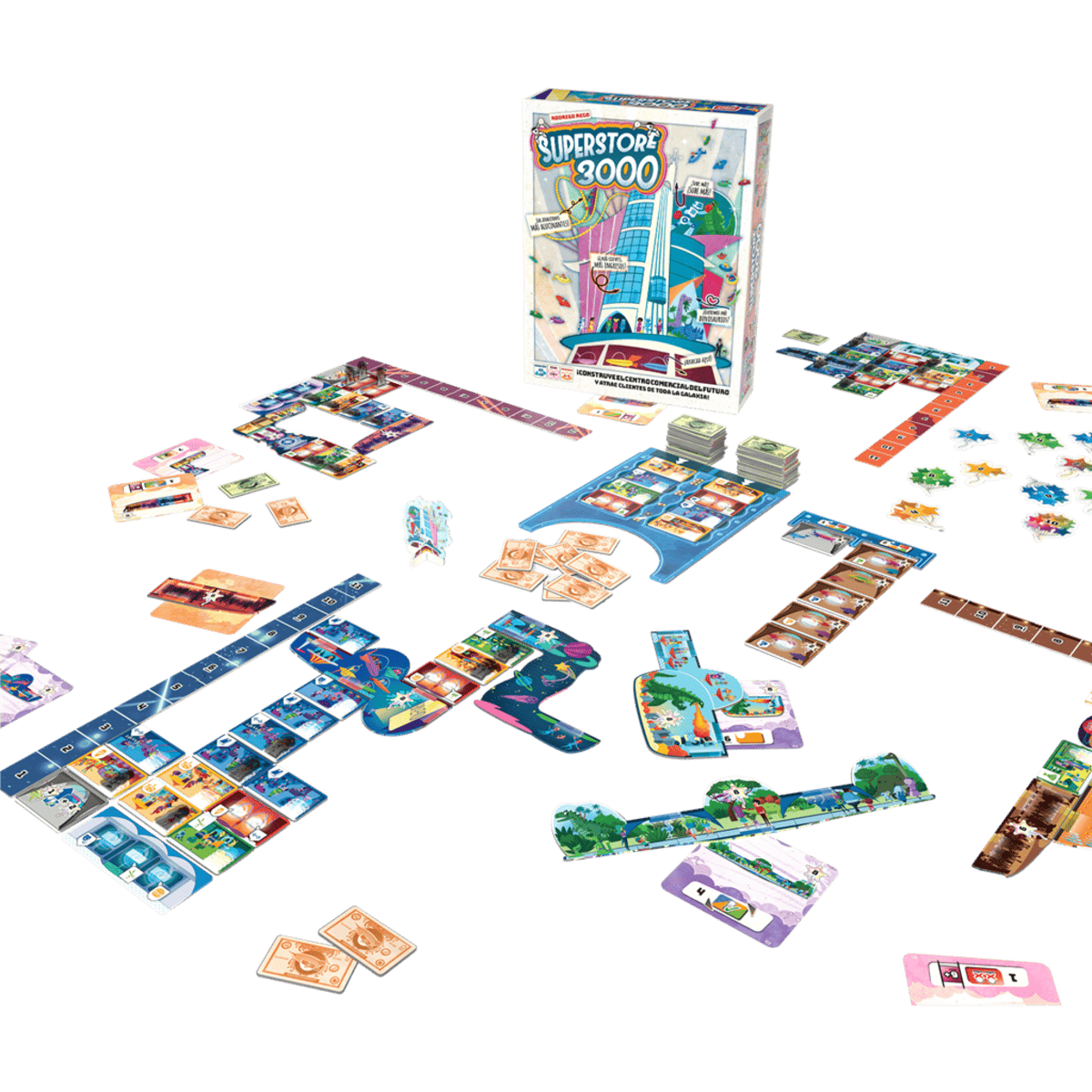 Superstore 3000 es un juego de mesa familiar que combina colocación de losetas, gestión del espacio y cumplimiento de objetivos. A lo largo de la partida, los jugadores irán añadiendo módulos a su centro comercial, creando pasillos, áreas recreativas, tiendas y estacionamientos que deberán responder a las necesidades específicas de los clientes que llegan en oleadas constantes.