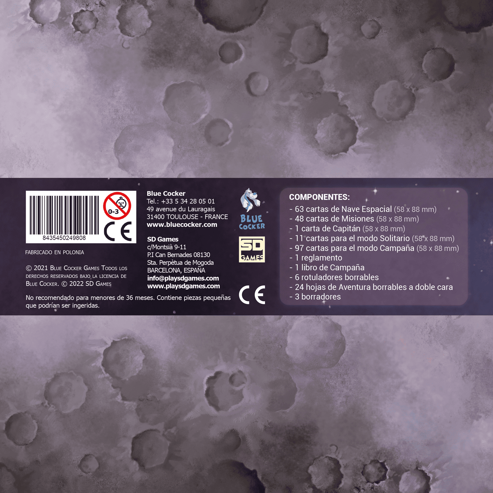 Welcome to the Moon incluye una variedad de componentes de alta calidad que facilitan la experiencia de juego: 63 cartas de Nave Espacial, 48 cartas de Misiones, 1 carta de Capitán, 11 cartas para el modo Solitario y 97 cartas para el modo Campaña, además de 6 rotuladores borrables, 24 hojas de Aventura a doble cara, 6 borradores, un reglamento y un libro de Campaña. Todos estos elementos combinan lo visual con lo táctico, ofreciendo partidas que desafían la estrategia, fomentan la planificación y recompensan la previsión.